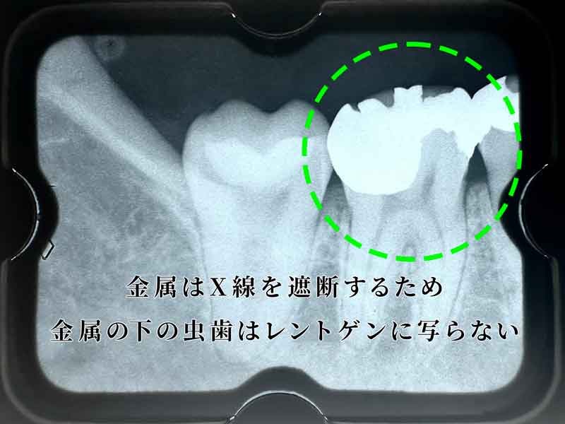 • 金属の下の虫歯はレントゲンでは写って来ないため、虫歯の発見が難しい